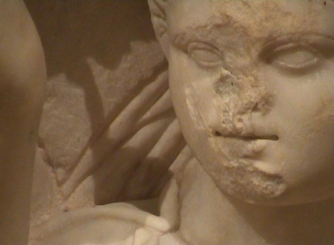 Vous êtes maintenant dans le hall principal du Musée National à Beyrouth. Un garde vous rappelle que vous êtes encouragés à toucher les objets archéologiques. Une voix dans votre casque vous suggère de lécher la pierre. Vous êtes maintenant face à un trou dans le mur dans la partie inférieure gauche d’une mosaïque. La voix du casque vous indique que ce trou a été causé par un sniper. Par curiosité, vous appelez le 1-9-9-1 afin d’écouter le reste de l’histoire.