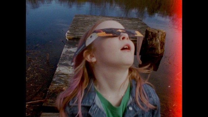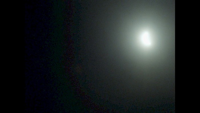 A group of people gather together to observe two passing celestials.